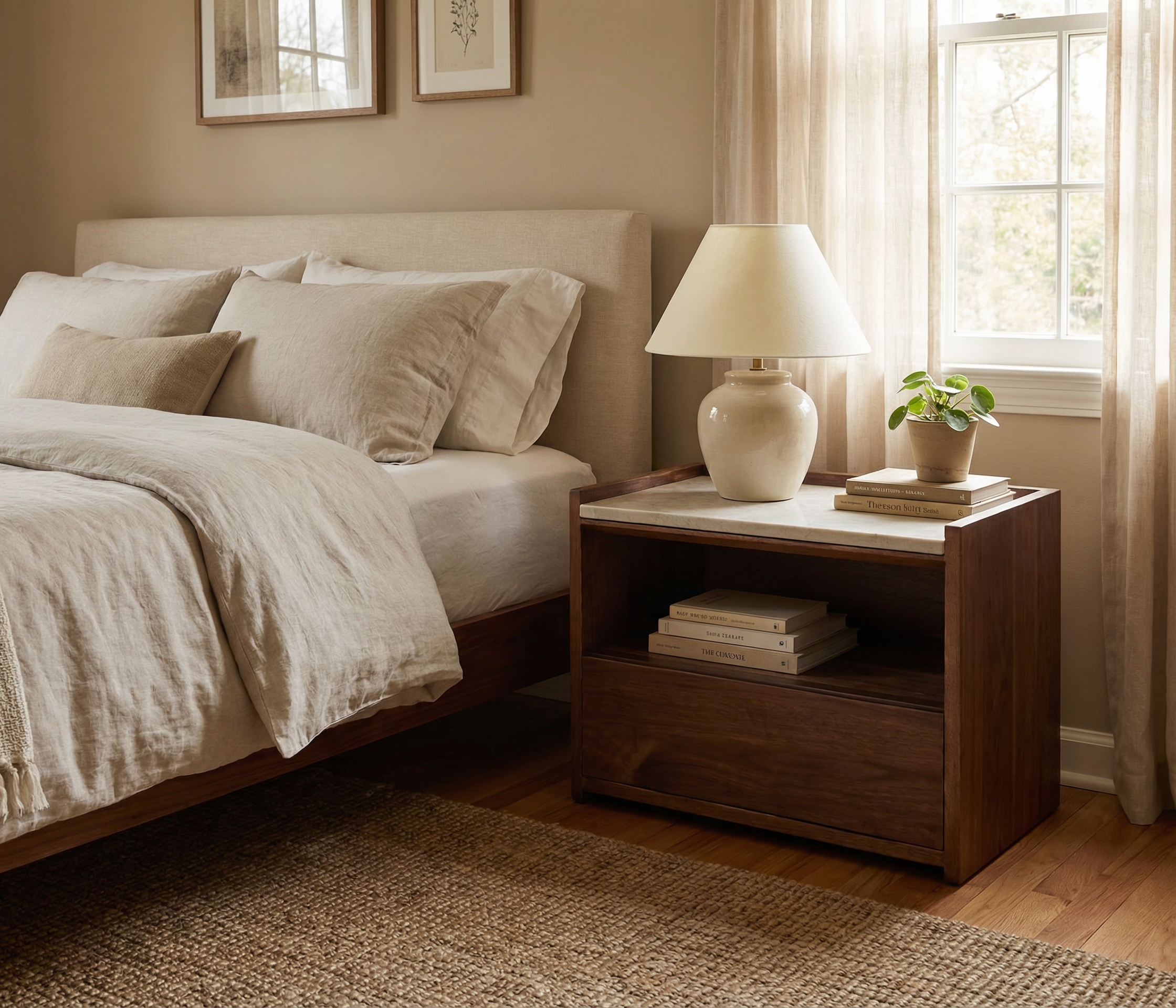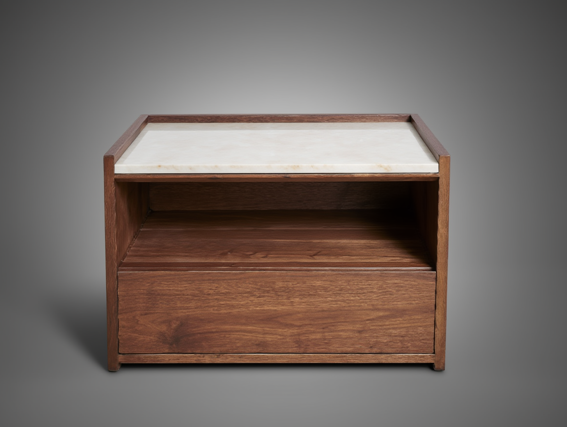 - Proporciones Equilibradas: El mueble está dividido horizontalmente en tres secciones visuales: la tapa superior, el nicho abierto y el cajón inferior. Las proporciones entre el espacio abierto y el cerrado (cajón) están bien balanceadas, creando una composición armónica y funcional. El nicho abierto es ideal para libros o dispositivos de acceso rápido, mientras que el cajón ofrece almacenamiento oculto.