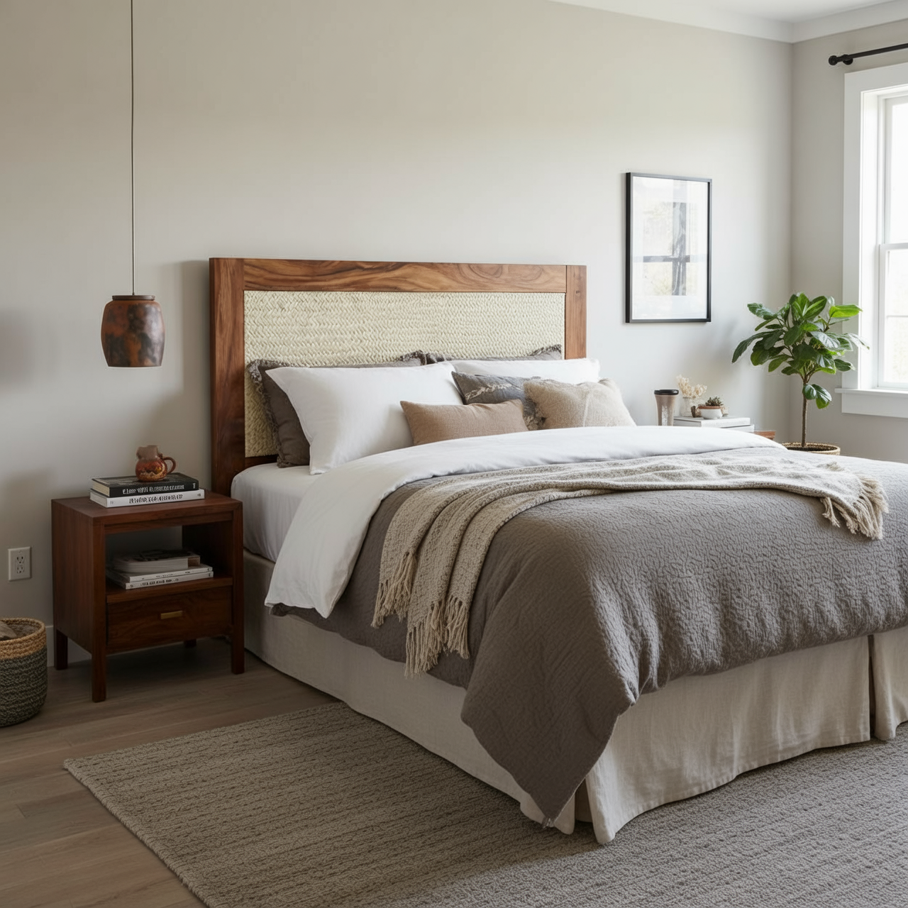- Estilo: El diseño combina la calidez de la madera con la textura ligera del tejido, creando un estilo bohemio o de playa moderna que complementa la decoración de la habitación.