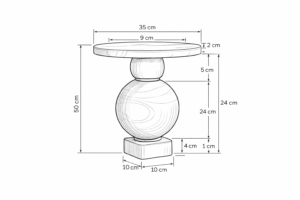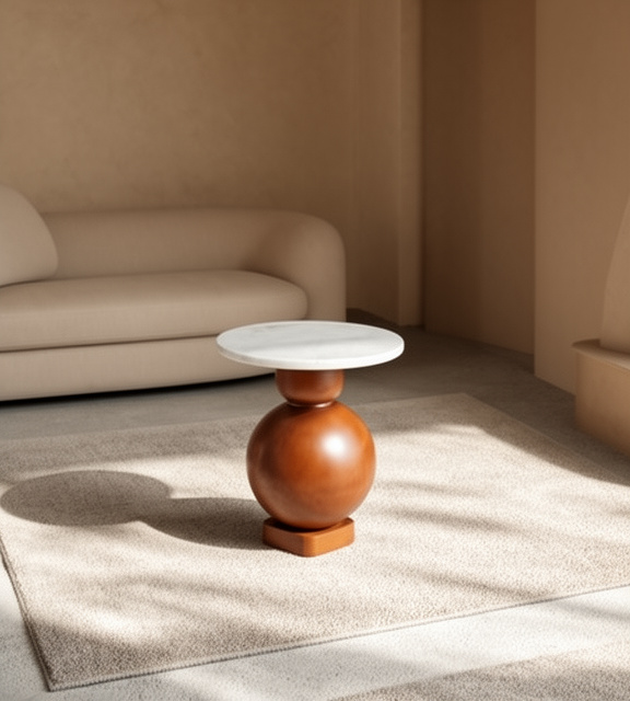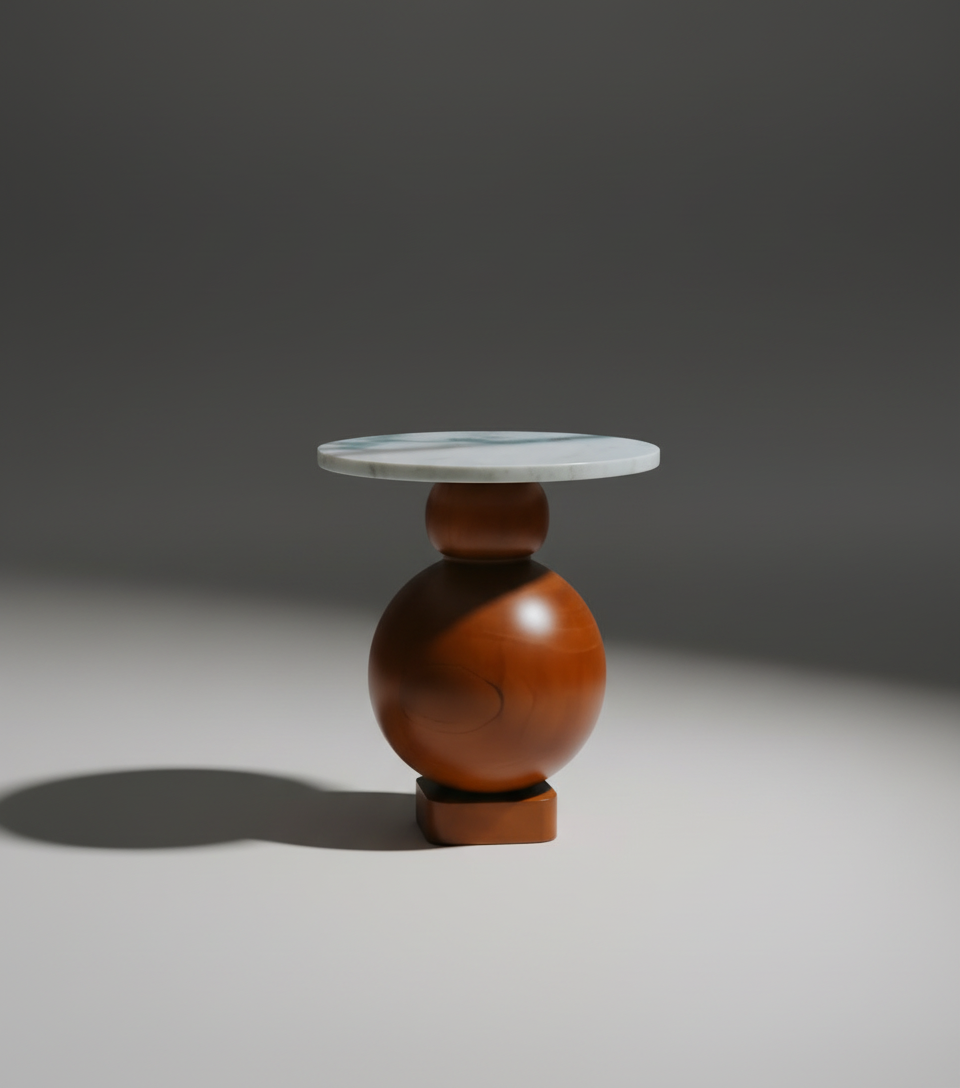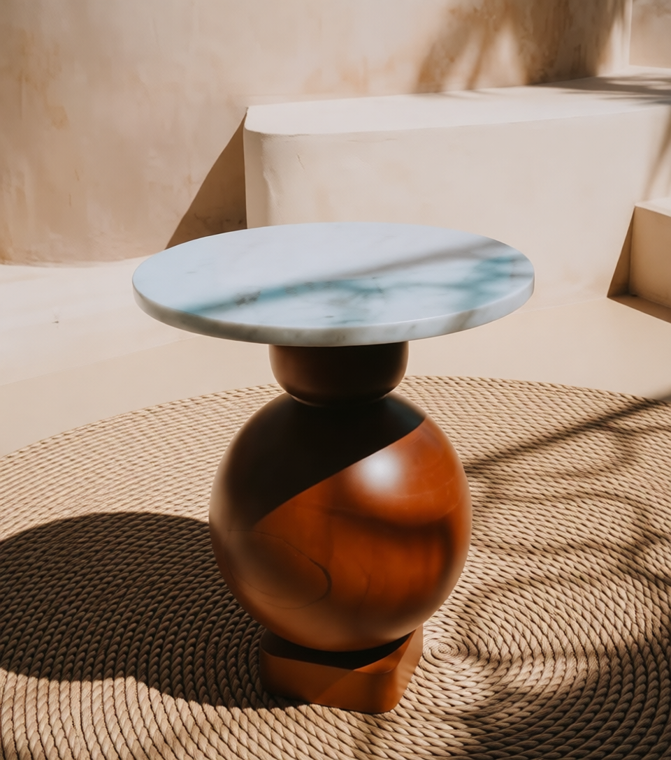 - Elemento intermedio: una pieza más pequeña, también de forma redondeada (una esfera achatada o disco grueso) que funciona como nexo para unir la gran esfera de madera con la parte inferior de la tapa de mármol.